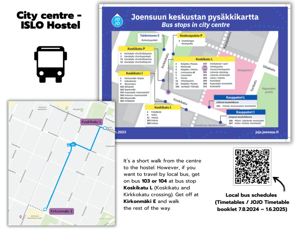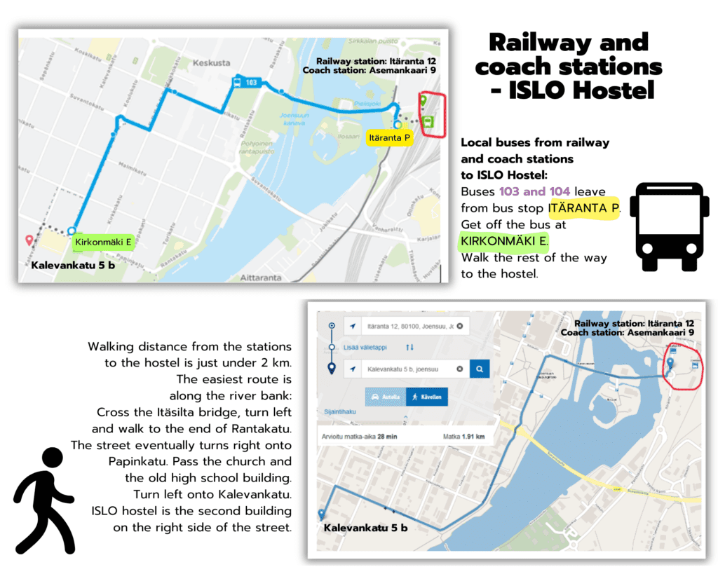 You can easily reach the hostel by public transport. The railway and coach stations are less than 2 km away. If you don´t want to walk to the hostel, hop on local bus 103 or 104. Have a look at their schedules on Joensuu regional transport website: JOJO